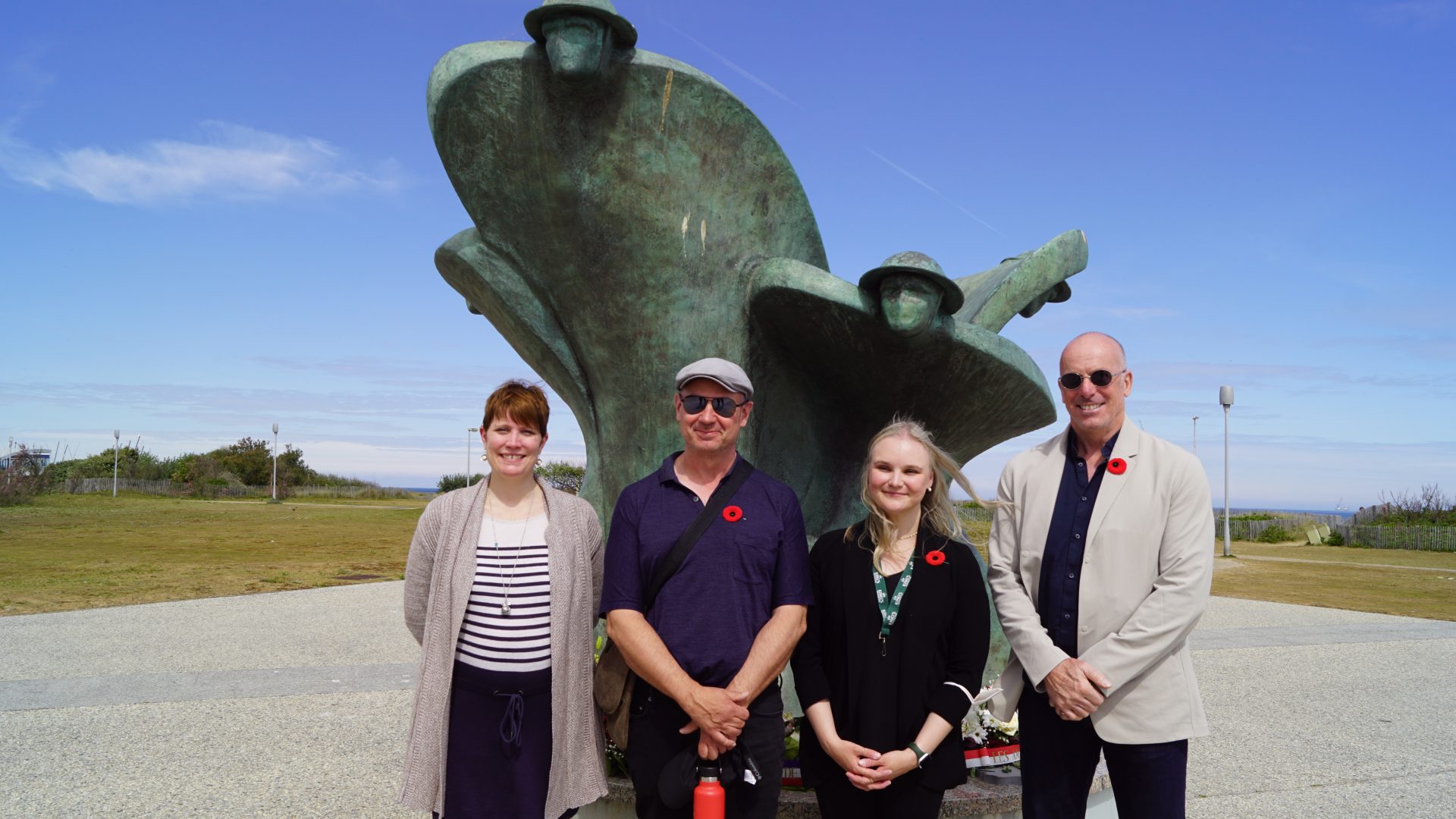 Rebecca Le Savoureux (left) stands in front of the Juno Beach Centre at the Remembrance and Renewal memorial sculpture with Dr. Graham Broad, Professor Katrina Paiserbek, and Dr. David C. Malloy from King’s University College.