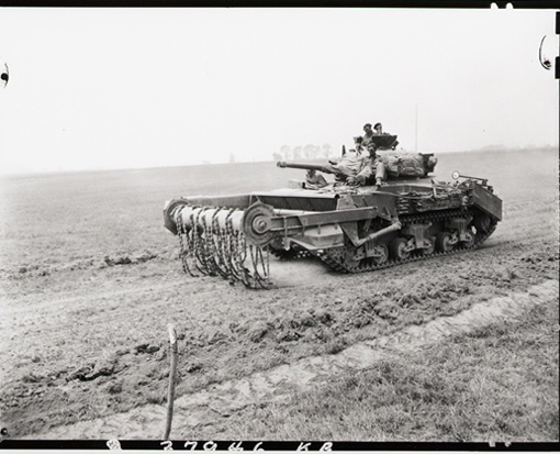 Sherman flail tank near Thaon, France, 6 August 1944. Mines are exploded as chains attached to a rotating drum hit the ground.