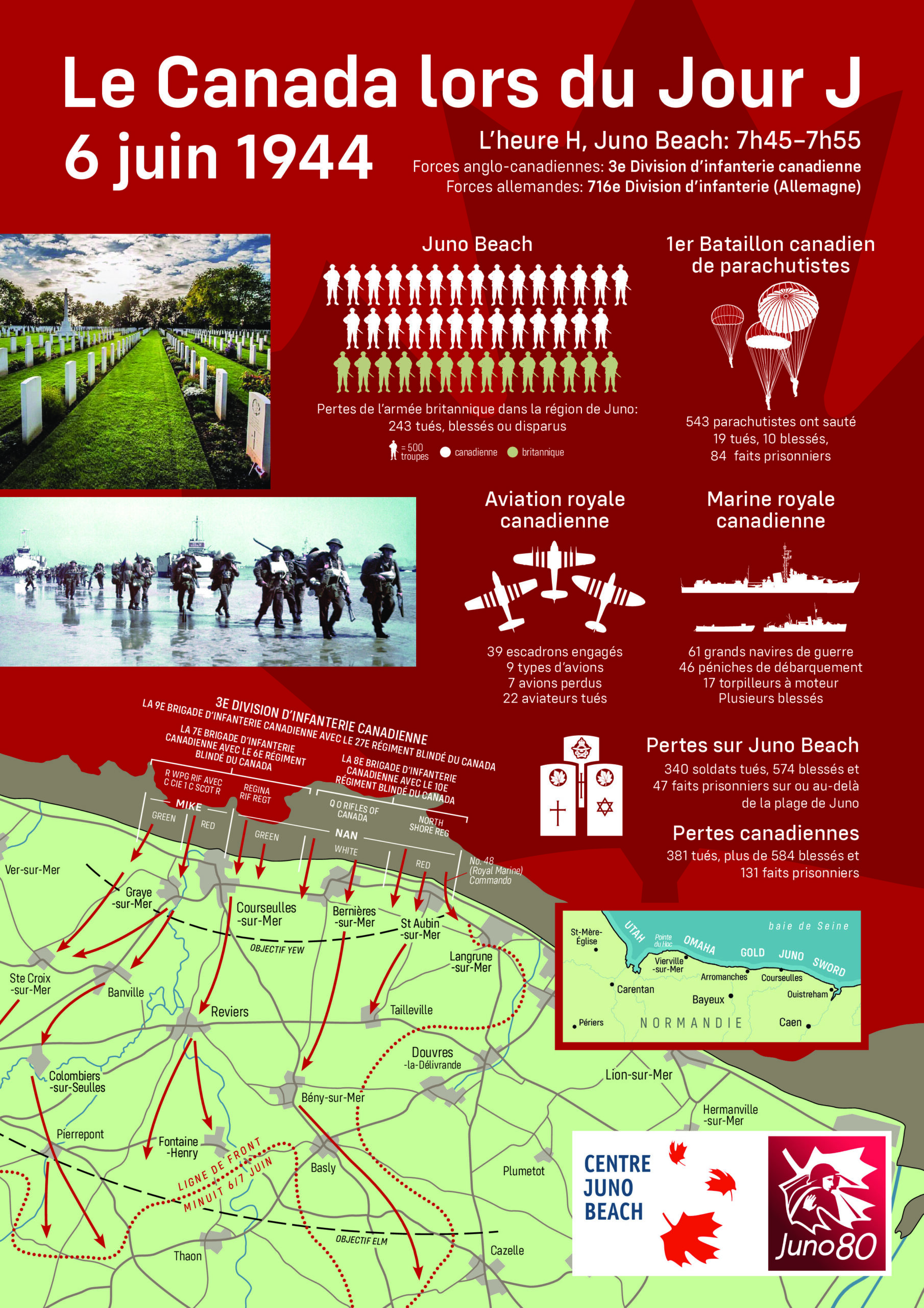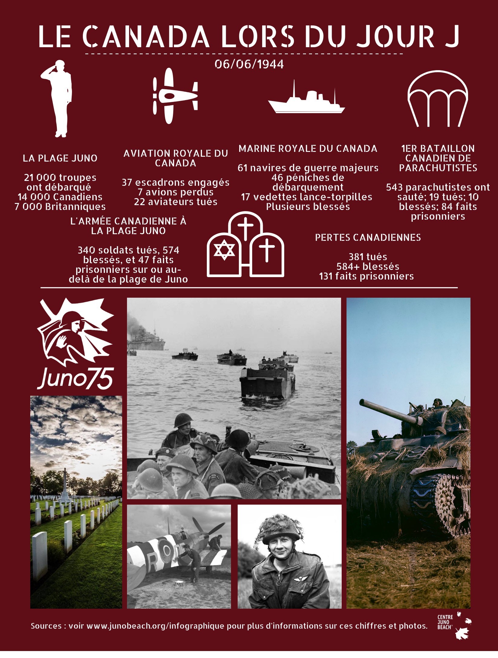 Le Centre Juno Beach a récemment publié un document infographique d’une page, en anglais et en français, mettant en lumière la contribution du Canada au Jour J, le 6 juin 1944.