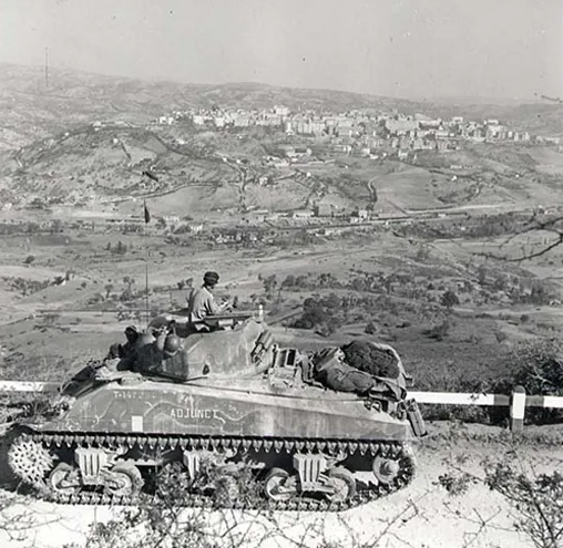 From higher ground, a 14th Armoured Regiment (Calgary) Sherman tank covers the progression of the West Nova Scotia Regiment towards Potenza, September 20th, 1943. Photo by Alexander M. Stirton. Department of National Defence / National Archives of Canada, PA-144103.